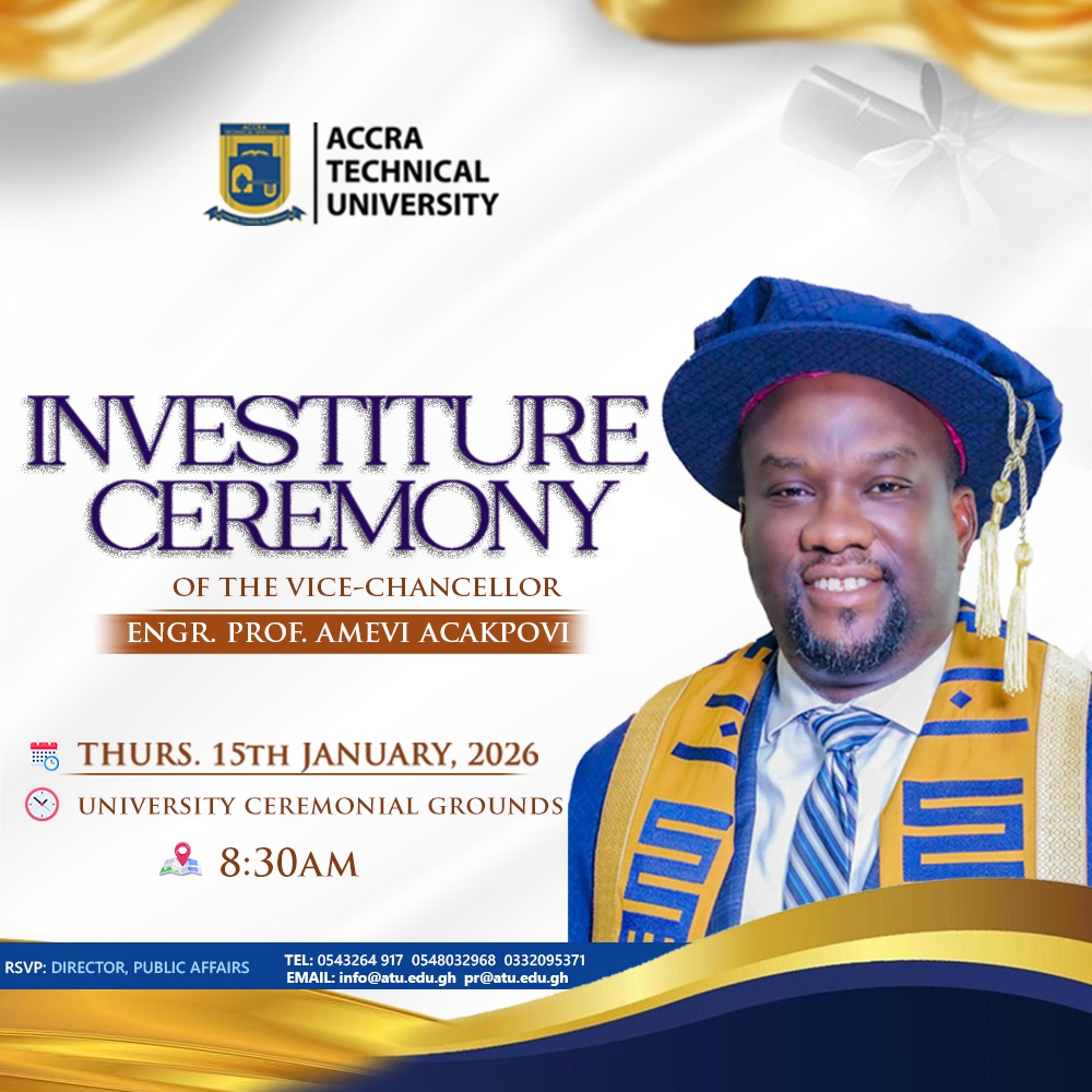 Accra Technical University invites the entire university community to the Investiture of the Vice-Chancellor, ENGR. Prof. Amevi Acakpovi.